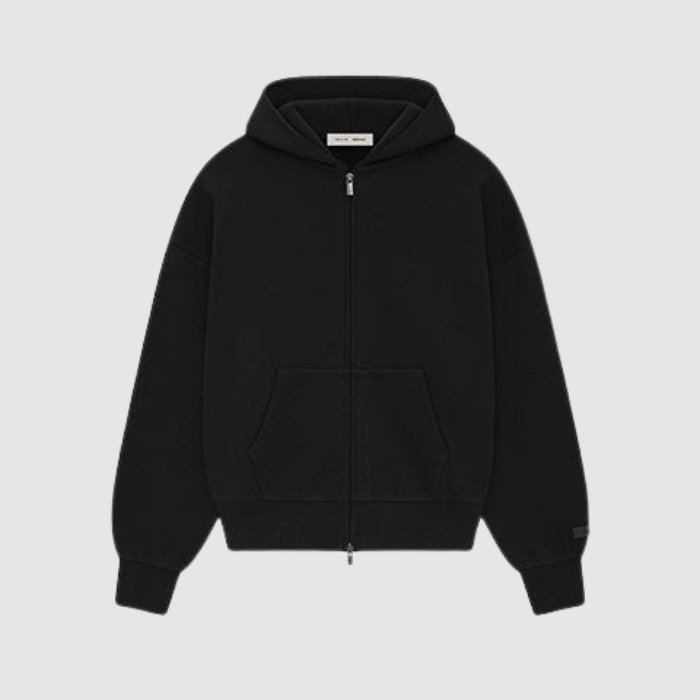 The ESSENTIALS Classic Full Zip-Up Hoodie in Black is crafted from premium mid-weight fleece, delivering a soft, structured feel ideal for everyday wear. Check out our Essentials Sweatpants, Designed with the signature relaxed Essentials fit, it features slightly dropped shoulders and a smooth brushed interior for elevated comfort. The full-length zipper offers easy layering, while the clean black colorway gives it a timeless, versatile look. Subtle Essentials branding is printed across the chest, and the design is finished with the signature Fear of God rubberized label on the hood. Rib-knit cuffs and waist hem ensure a secure, durable fit.