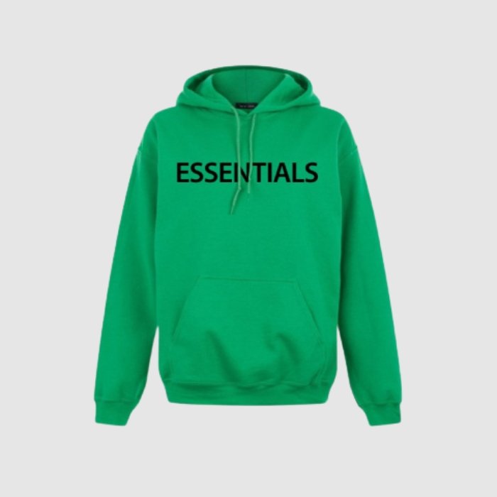The Essentials Oversized Sweat Hoodie in Green is crafted from premium mid-weight fleece, offering soft comfort, durability, and a relaxed streetwear fit. Checkout our premium Essentials Jackets designed with an oversized silhouette and dropped shoulders, it delivers a modern, cozy look. The front features subtle Essentials screen-printed branding, while functional details include a double-layer hood, kangaroo pocket, rib-knit cuffs and waist hem, and a soft brushed interior for added comfort. The Fear of God Essentials rubberized label stitched on the hood adds a signature finishing touch.